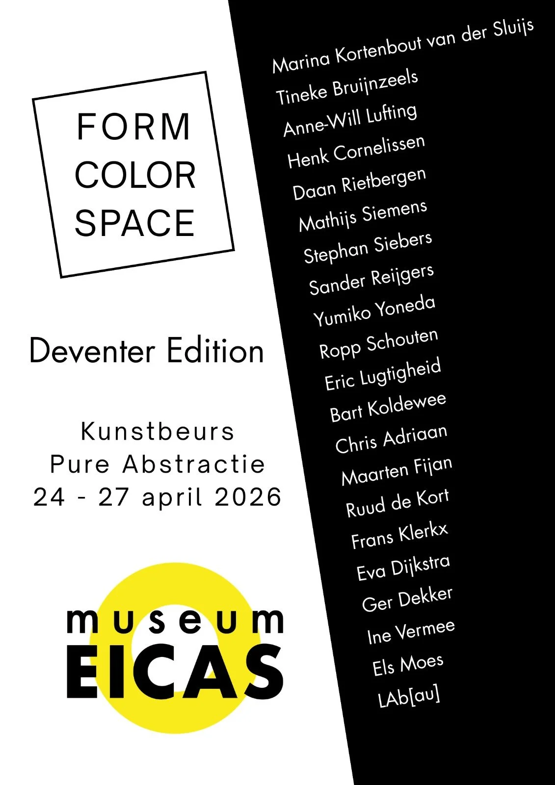 Er is werk te zien van 22 (inter)nationale kunstenaars en alle werken zijn te koop. Form Color Space werd in 2023 opgericht door kunstenaar en curator Eric Lugtigheid met als doel de positie van abstracte en minimalistische kunst binnen de huidige kunstwereld te versterken. Voor deze presentatie werkt Lugtigheid samen met kunstadviseur en curator Manuela Klerkx.